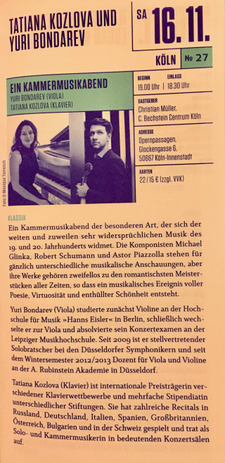 Die Pianistin Tatiana Kozlova moderiert das Konzert und bringt die acht Präludien und Fugen des Ersten Bandes auf ganz eigene ergreifende Weise zum Erklingen und bietet damit sowohl dem „Klassik-Neuling“ als auch dem „Bach-Experten“ die Möglichkeit, Bachs musikalisches Meisterwerk auf neue Weise zu erleben.